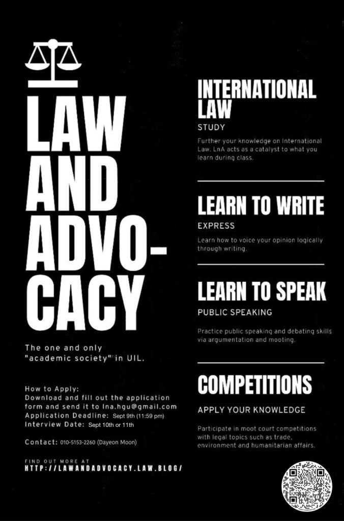 국제법학회 Law and Advocacy, LnA에서 신입 회원을 모집합니다.